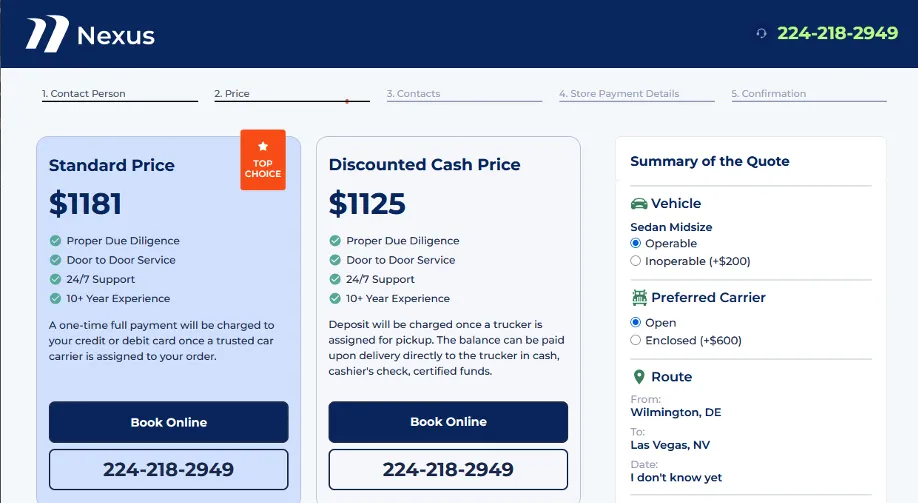 Clients can easily get a free quote on the Nexus website by entering only the delivery and pickup locations, the type of car to be shipped, and an estimated delivery timeframe or date. Nexus generates multiple options, providing customers with a precise and reliable way to get a vehicle from point A to point B safely.